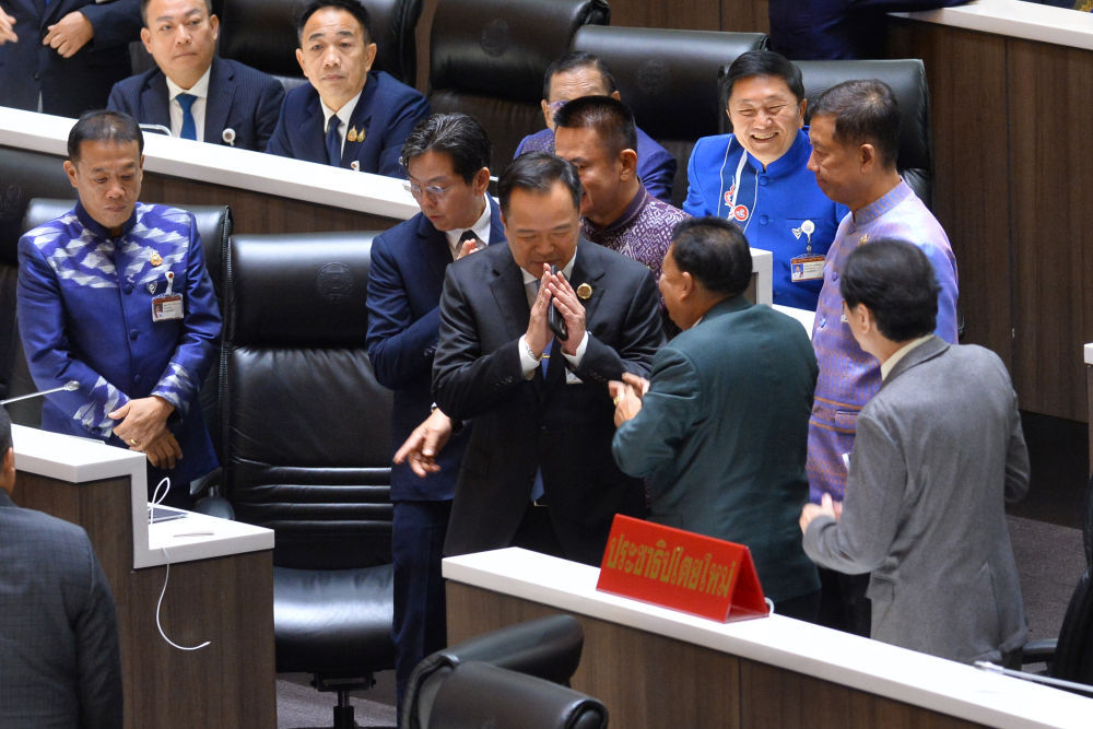 9月5日,在泰国曼谷国会下议院,泰国自豪泰党党首阿努廷(前中)接受祝贺。新华社发(拉亨摄)